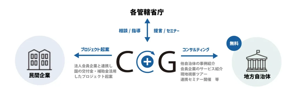 国の資金等を活用し、全国の法人会員企業のサービスやソリューションにより、地方自治体の活性化を実現する非営利組織です。