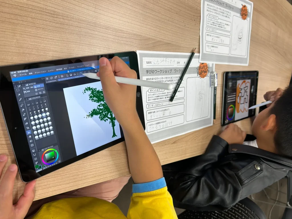 ペンタブを使用してイラストを描く基礎を学び、実践学習として季節に合ったお題「ハロウィン」でポストカードを作成しました。デジタルで描くイラストは表現の幅が広がり、たくさん素敵な作品が完成しました。大人の参加者からは今後の実生活で使用できるスキルをもっと練習して学びたいという意欲的なの声もありました。