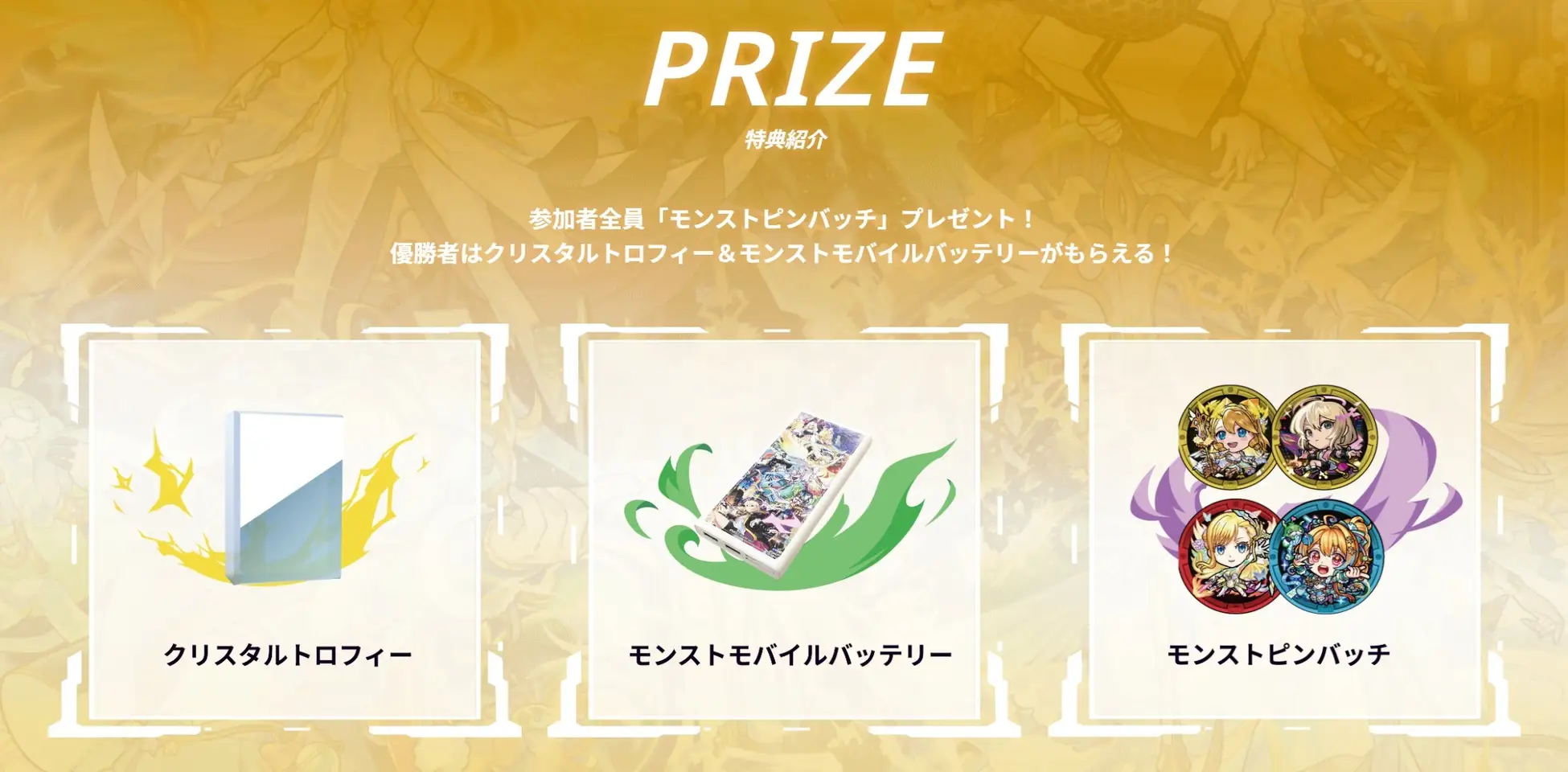お待ちしております。優勝者の特典は クリスタルトロフィーとモンストモバイルバッテリー!