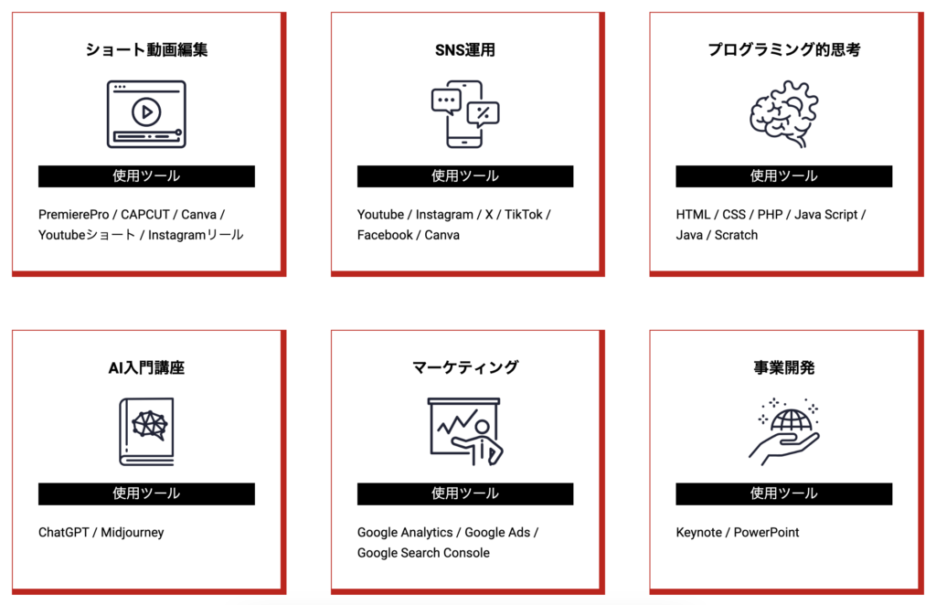 REDEEリスキリング講座は助成金を活用させより深く学ぶ「REDEE10時間リスキリング」、明日から使え、最短最速で学ぶ「REDEE1DAYリスキリング」の2つの受講プランがあり、どちらのプランでも下記6つの講座の中から選択が可能です。