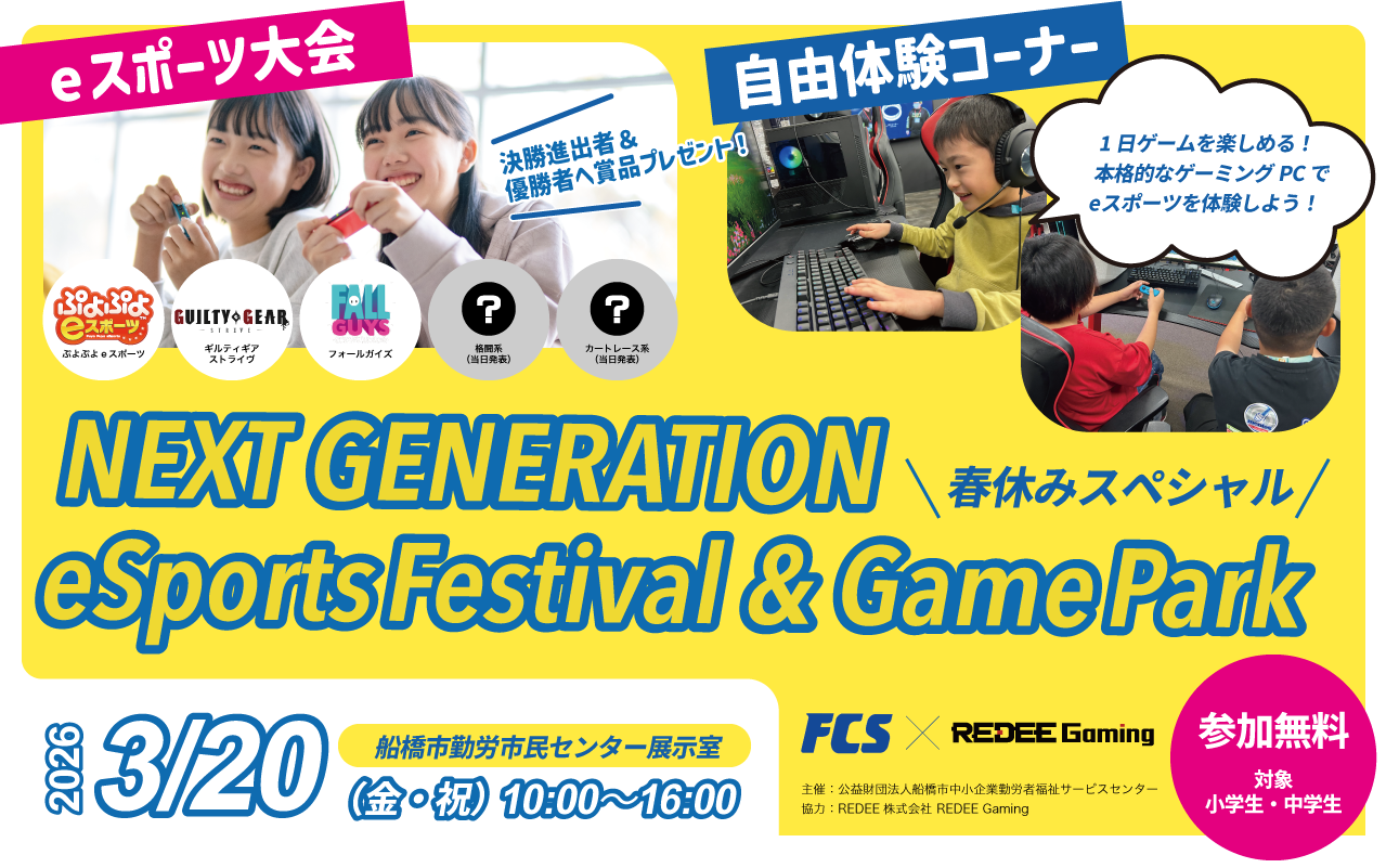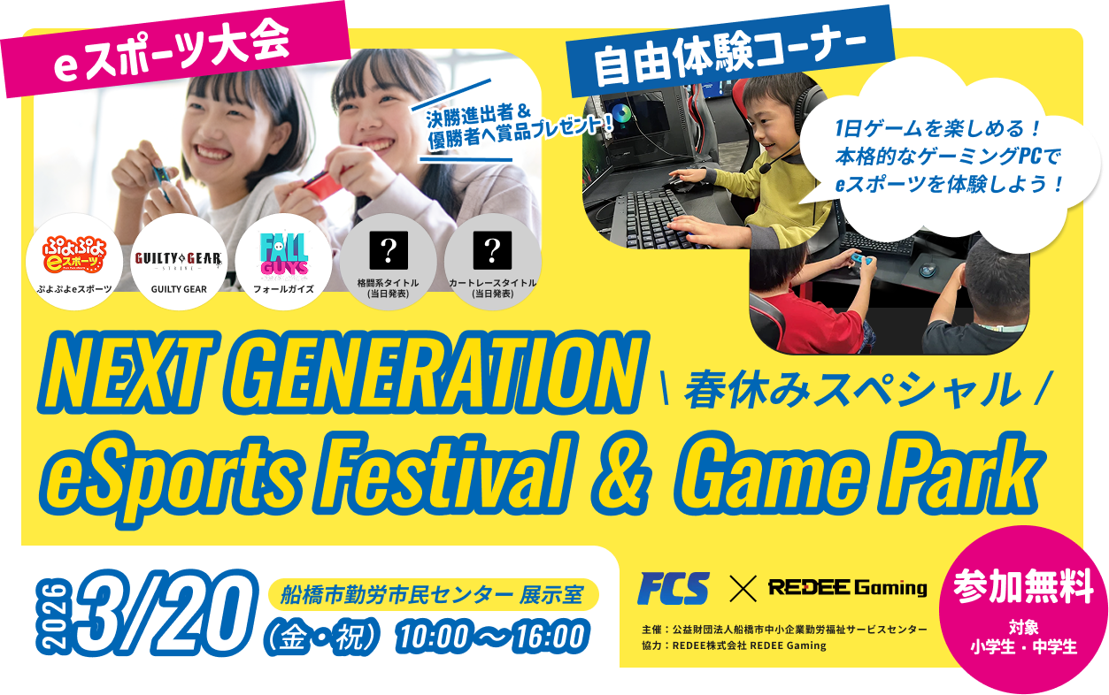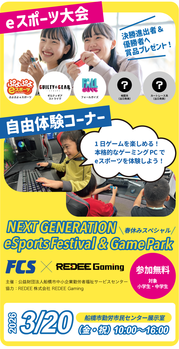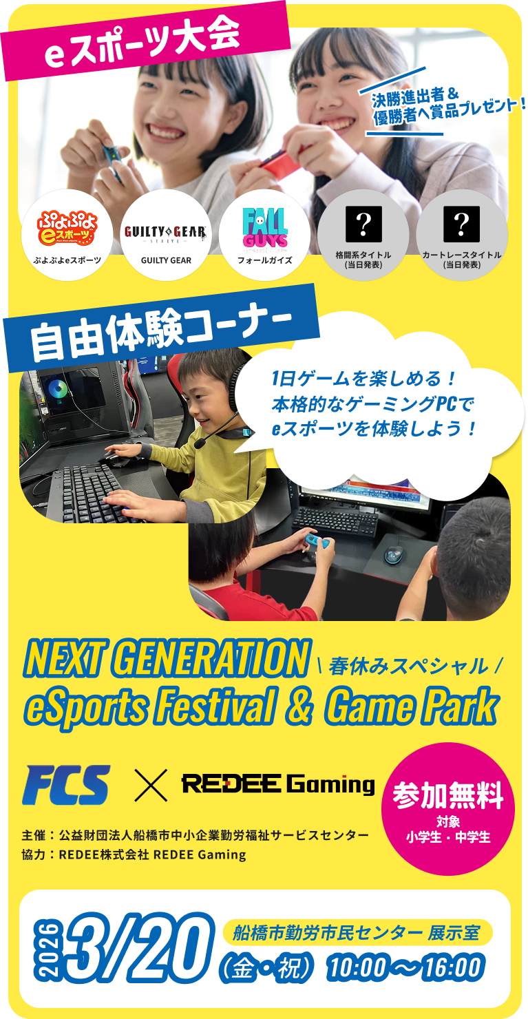 格闘ゲーム・パズルゲーム3・レース系・生き残り系など人気タイトルのミニ大会開催!eスポーツ王を目指せ!自由体験コーナーもあるので色々なゲームタイトルを体験しよう!