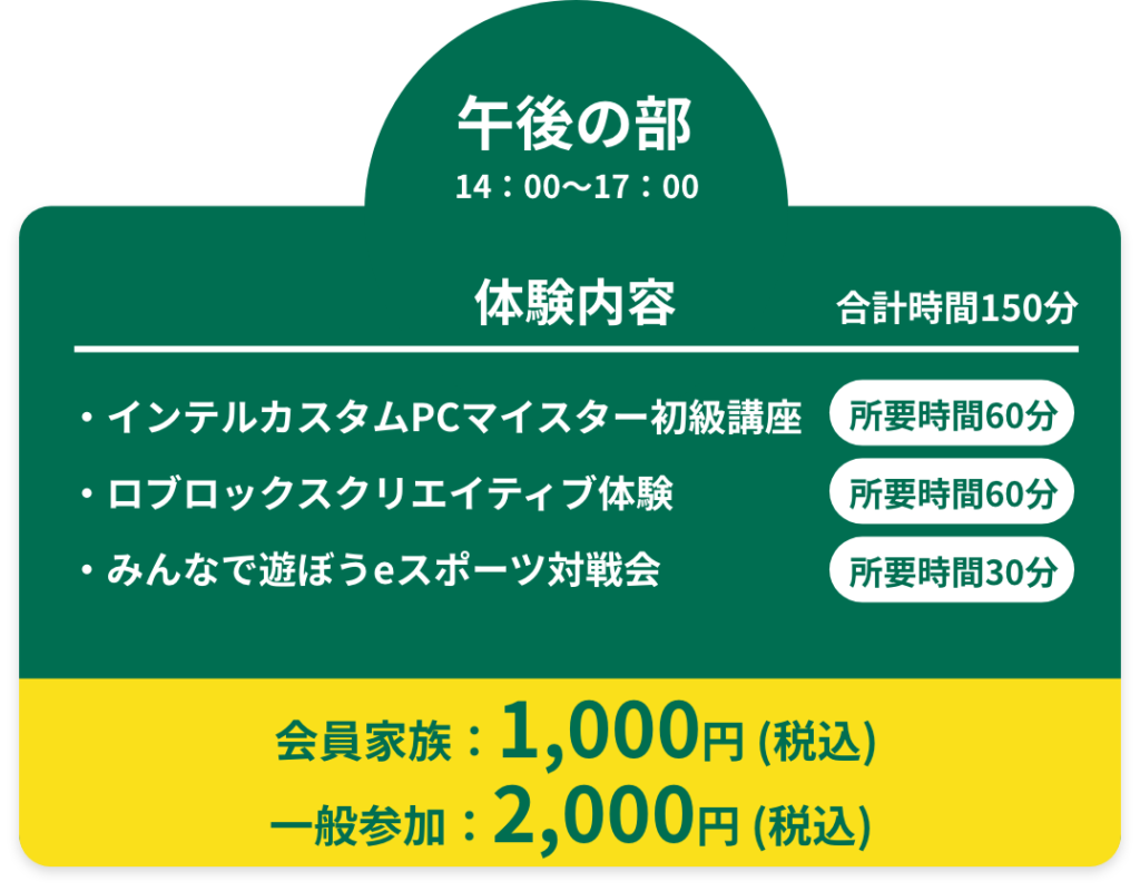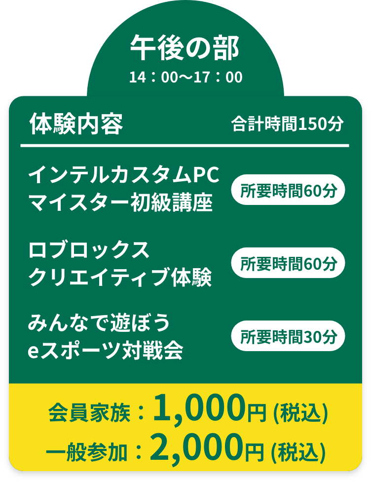 「午前の部」と「午後の部」の各コースで、 インテルカスタムPCマイスター初級講座 / ロブロックスクリエイティブ体験 / みんなで遊ぼうeスポーツ対戦会 をまとめて体験できます!