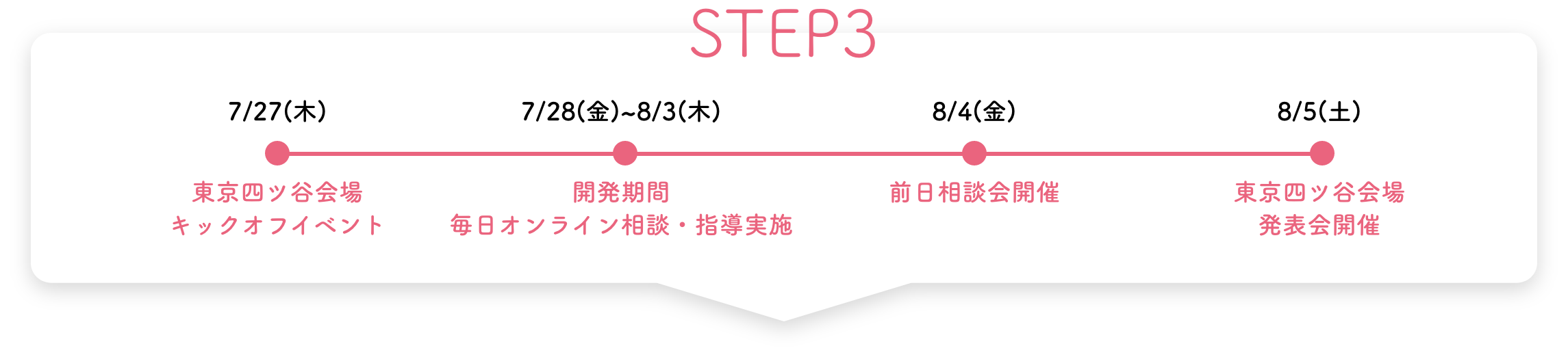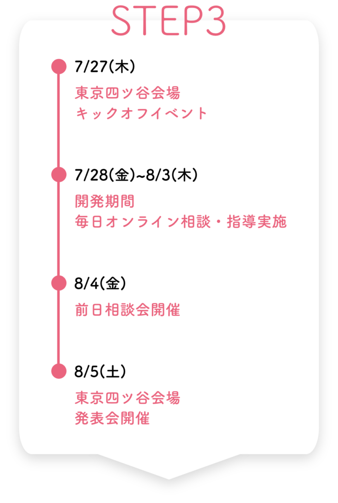 ・キックオフイベント:7月27日(木)11:00~16:00 (オリエンテーション、開発手順説明等)