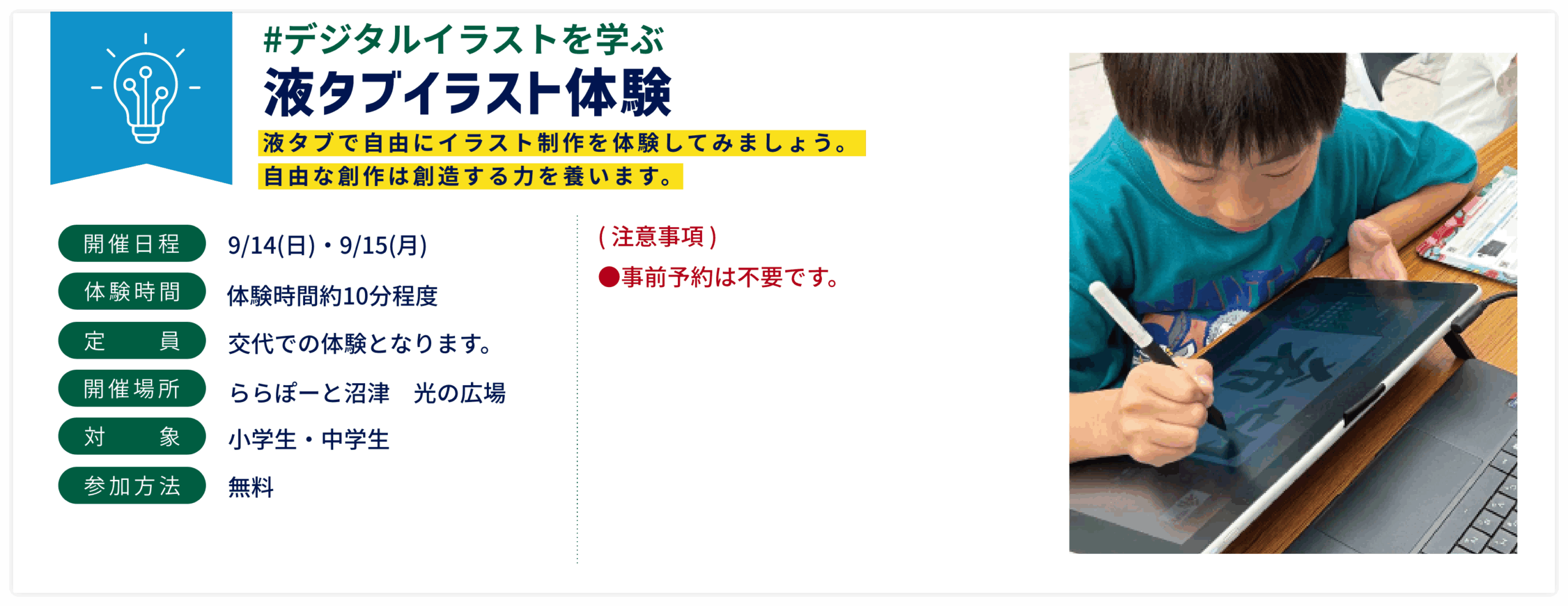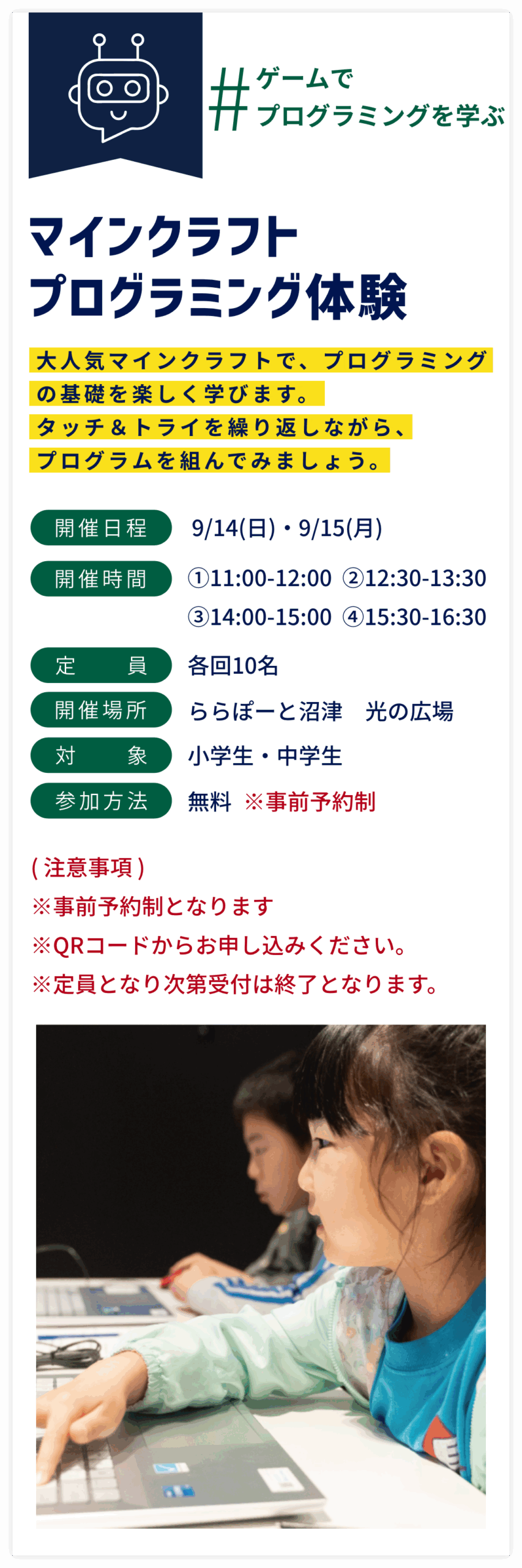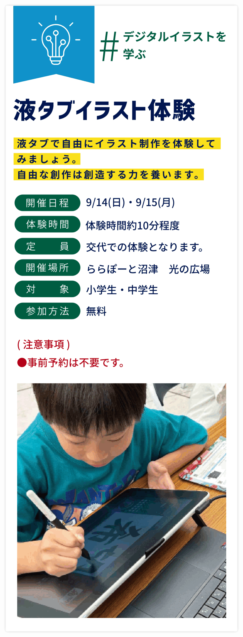 将来につながるきっかけをつかみ、みんなで楽しく学ぶ学習イベント!!デジタルを身近に感じることができる体験がたくさん!ぜひ皆様で参加してみてください!