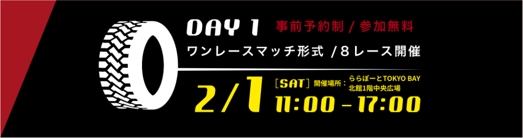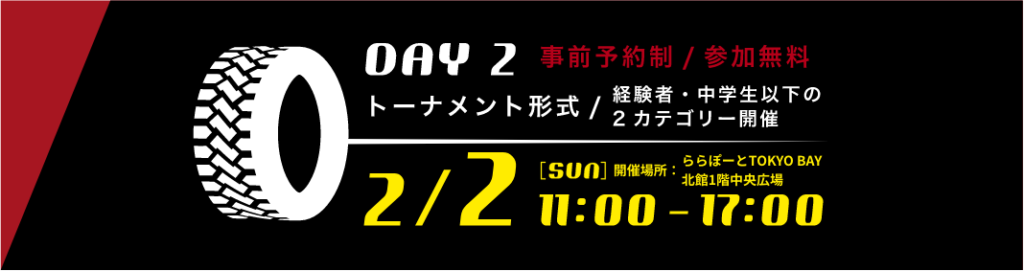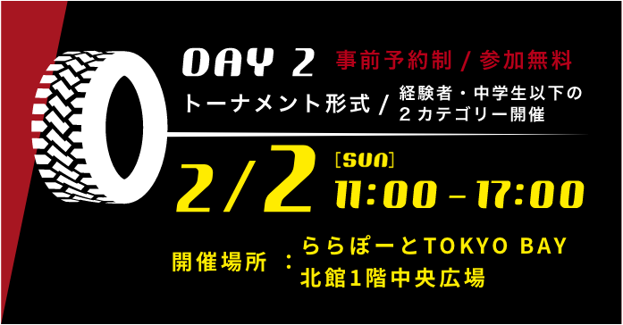 参加者カテゴリーとして「経験者部門」・「中学生以下部門」の2カテゴリーを用意。それぞれ6名づつによる予選・準決勝・決勝と勝ち上がりいただきます。大会中はプロの実況者がレース実況しながら解説と会場を盛り上げを致します。各レースの優勝者様にはファステストラップを記載したタイム証をプレゼント。